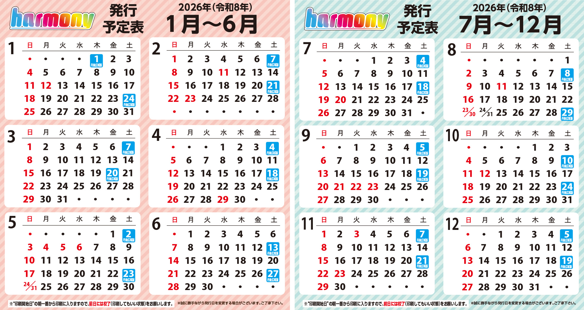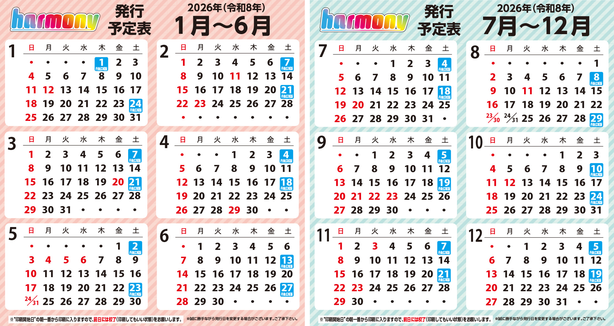 ハーモニーの年間発行予定はこちらからご確認くださいませ。