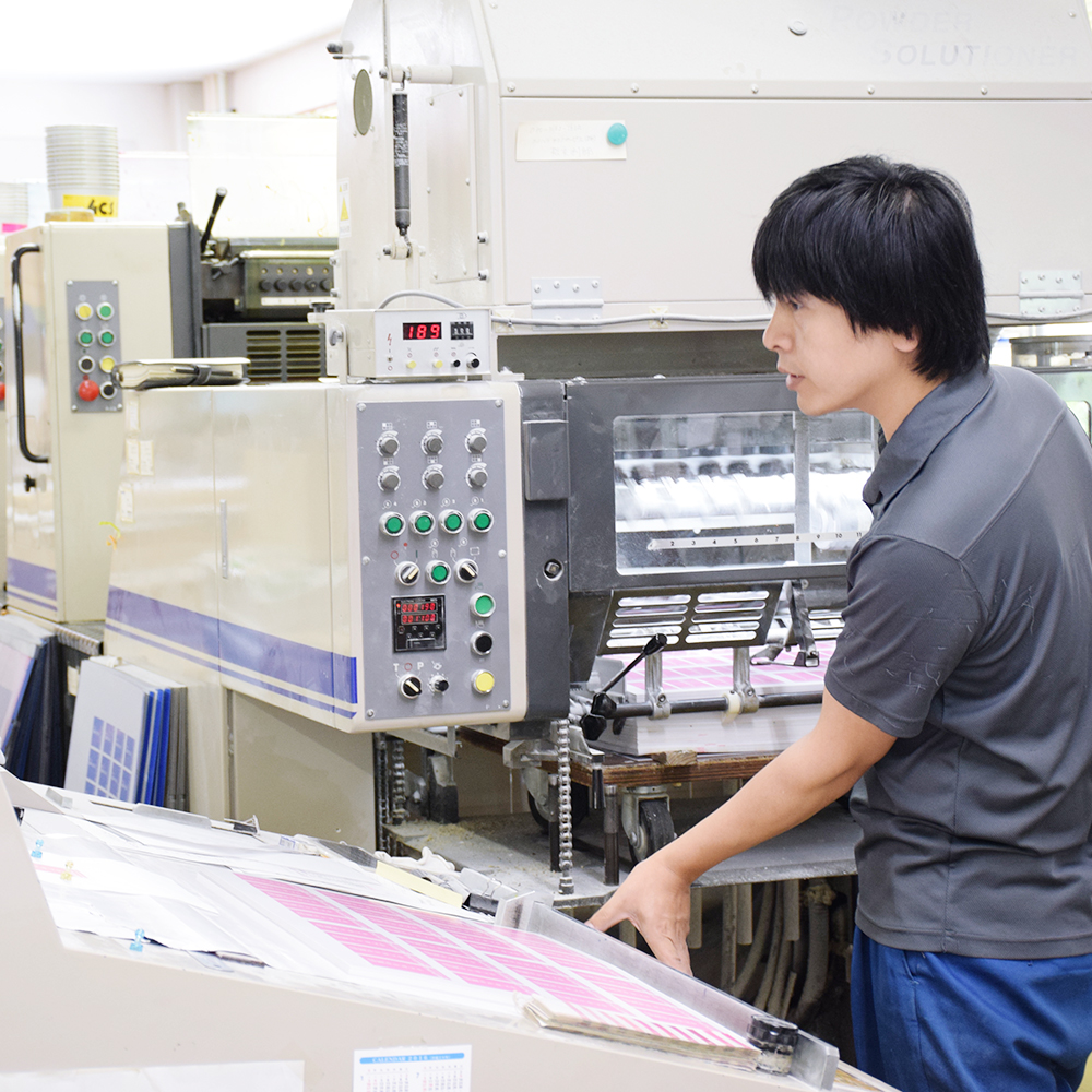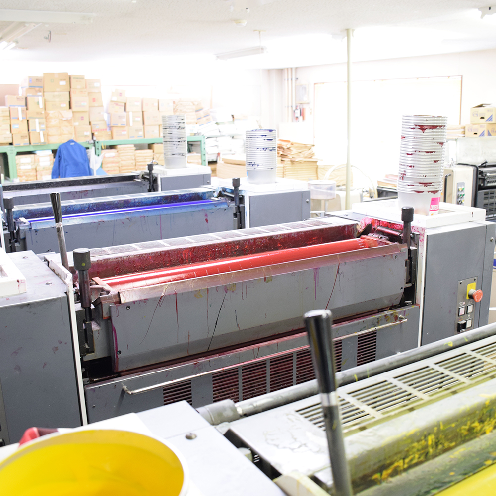 たつみ印刷では、4色機を2台備え、自社設備による微細な色調整と、短納期、小ロット制作が可能です。